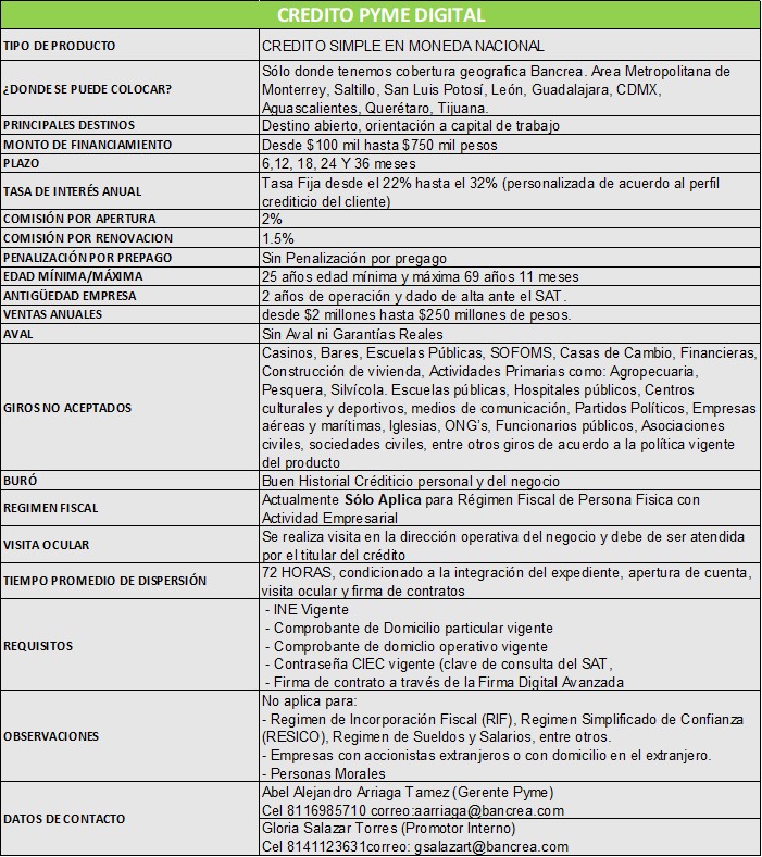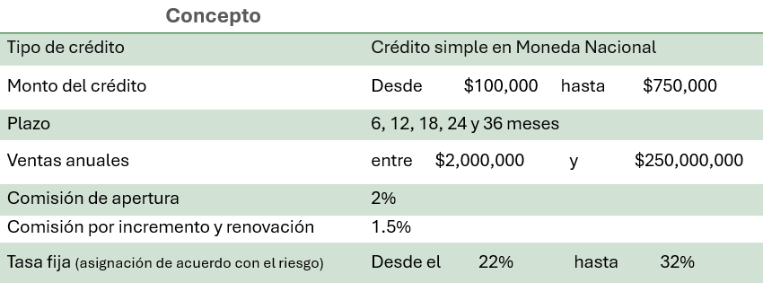 Dest ino del crédito: Abierto con enfoque a capital de trabajo, financiamiento para expansión, proyecto de inversión productivo, compra-venta de inventario, entre otros.