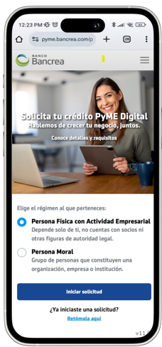 Puedes ingresar a nuestro portal institucional desde el apartado PYME DIGITAL o también descargar nuestra aplicación móvil y seleccionar el banner publicitario para solicitar tu crédito en línea